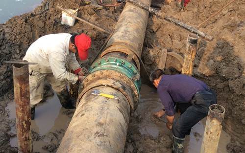 經(jīng)實(shí)地勘查,因支撐土層被挖空后塌陷,造成近60米長(zhǎng)的DN500供水主管分節(jié)脫落,真武鎮(zhèn)油田管轄區(qū)范圍大面積停水,幾萬(wàn)群眾的正常生產(chǎn)、生活用水受到影響,情況十分緊急。區(qū)自來(lái)水公司協(xié)助油田水廠根據(jù)現(xiàn)場(chǎng)情況,以最大程度縮短搶修時(shí)間、及早恢復(fù)供水為目標(biāo),綜合分析比對(duì)各種施工方法,科學(xué)制定了維修方案,并協(xié)助安排接水點(diǎn),供油田消防車應(yīng)急送水。經(jīng)過(guò)相關(guān)施工準(zhǔn)備后,搶修人員按照既定方案,迅速投入維修作業(yè),組織對(duì)脫落的管道進(jìn)行退拔,采用平承平插工藝對(duì)脫落的供水管道進(jìn)行重新定位、碰接。搶修人員頂著烈日連續(xù)作戰(zhàn),于下午5:00左右順利完成施工,使當(dāng)?shù)毓┧玫郊霸缁謴?fù)。