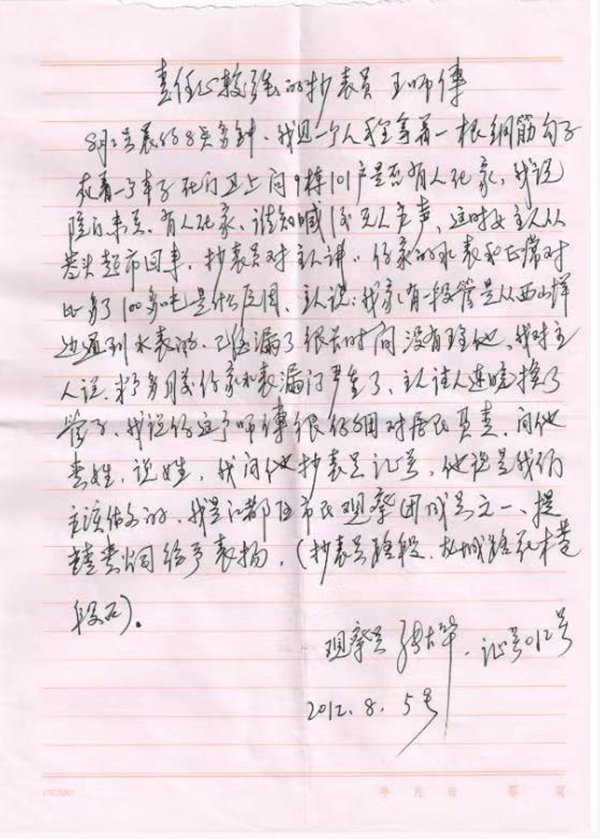 2012年8月5日,自來水公司收到一封來自江都市民觀察團(tuán)成員的表揚(yáng)信,信上寫著王梅富同志在一次日常工作中,發(fā)現(xiàn)有一用戶家中無人居住,嚴(yán)重漏水的問題,前后幾次往返鄰居和物業(yè)之間登記檢查,直至聯(lián)系上用戶,并確認(rèn)用戶已將水表閥門關(guān)緊,不再漏水,才放心離開。事后王梅富同志只是說,這是他工作中很平常的一件小事,是自己應(yīng)盡的工作職責(zé)。
