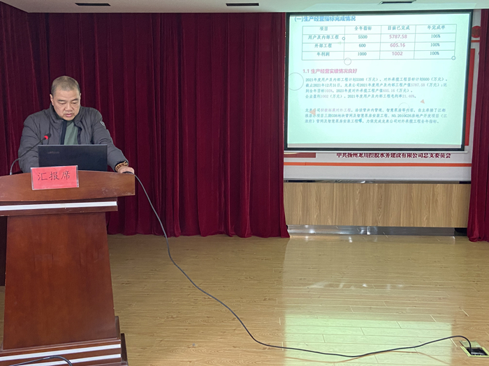 在本次大會匯報交流環(huán)節(jié),分別聽取了計劃財務部、運營技術部、黨群工作部、自來水公司、惠民區(qū)域供水公司、龍泉建設工程公司、龍川污水處理公司等七個部門單位2021年工作總結(jié)報告。各部門、子公司負責人分別圍繞2021年全年生產(chǎn)經(jīng)營指標、重點工作完成情況、存在的主要問題、解決對策以及2022年工作計劃作了交流匯報。