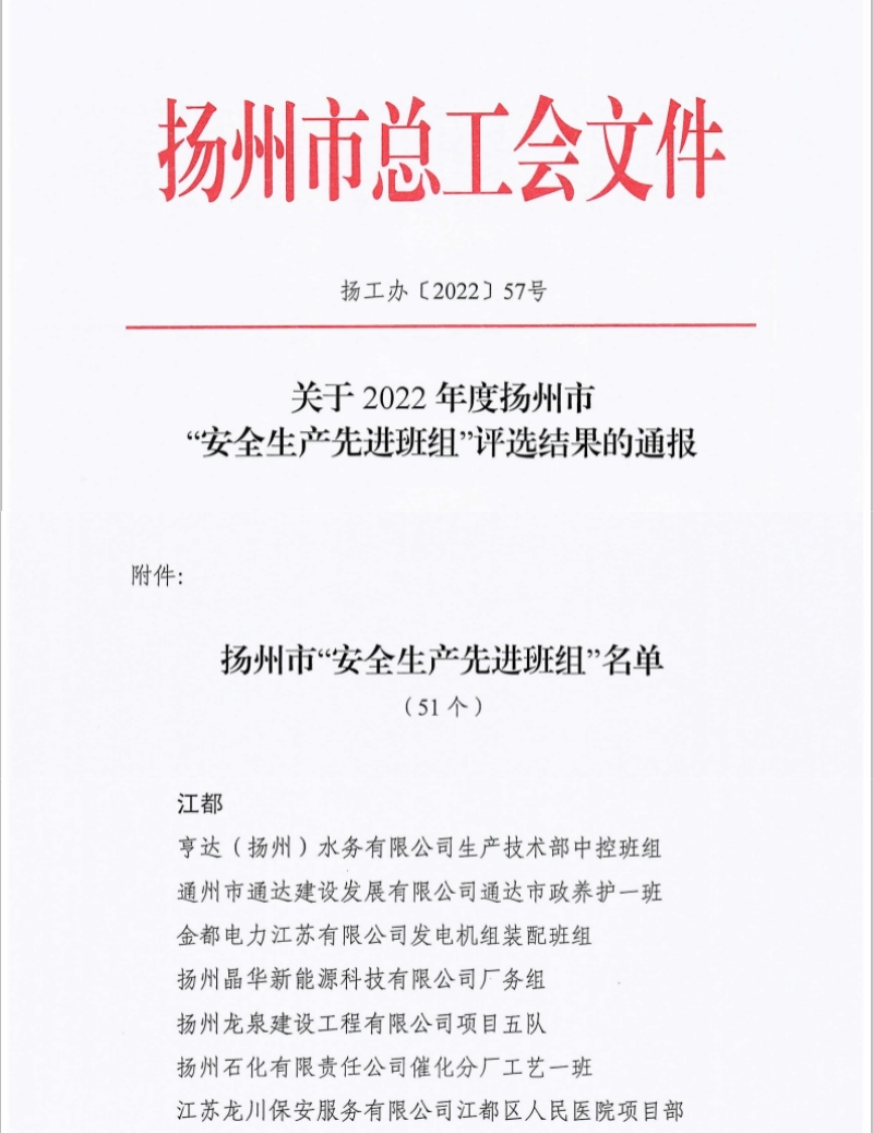 獲得揚州市“安全生產(chǎn)先進班組”的榮譽,是對這支隊伍2022年安全生產(chǎn)工作的充分認可與高度肯定,這將激勵他們在今后的工作中不負眾望、砥礪奮進,在公司內(nèi)部進一步發(fā)揮安全生產(chǎn)的引領作用。